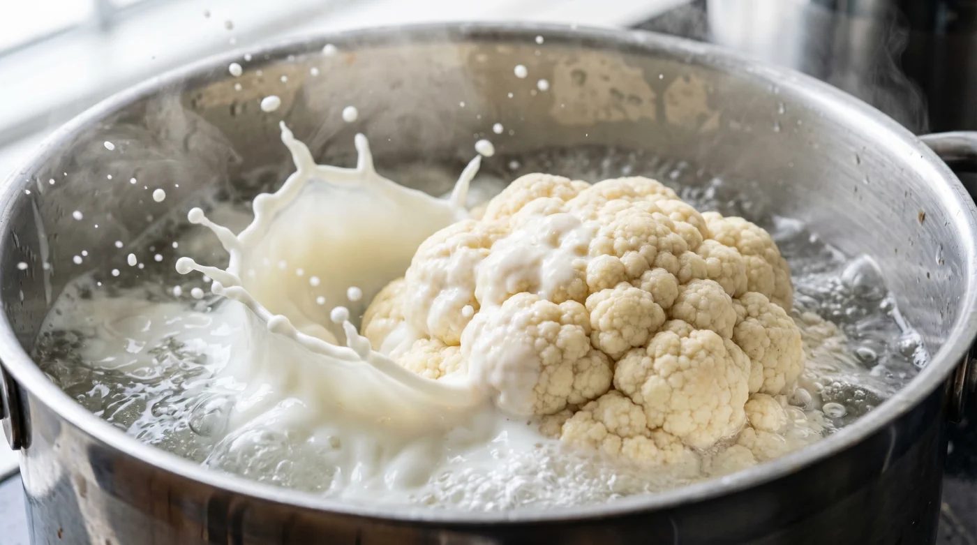 Genom att tillsätta en helt vanlig skvätt mjölk i kokvattnet förändrar du spelplanen i kastrullen direkt. Mjölkens proteiner och mycket milda, naturliga mjölksyra lägger sig som en buffert, en skyddande sköld runt varje enskild blomkålsbukett. Det handlar inte om att smaksätta, utan om att skapa en fysisk barriär som hindrar oxideringen från att fästa.