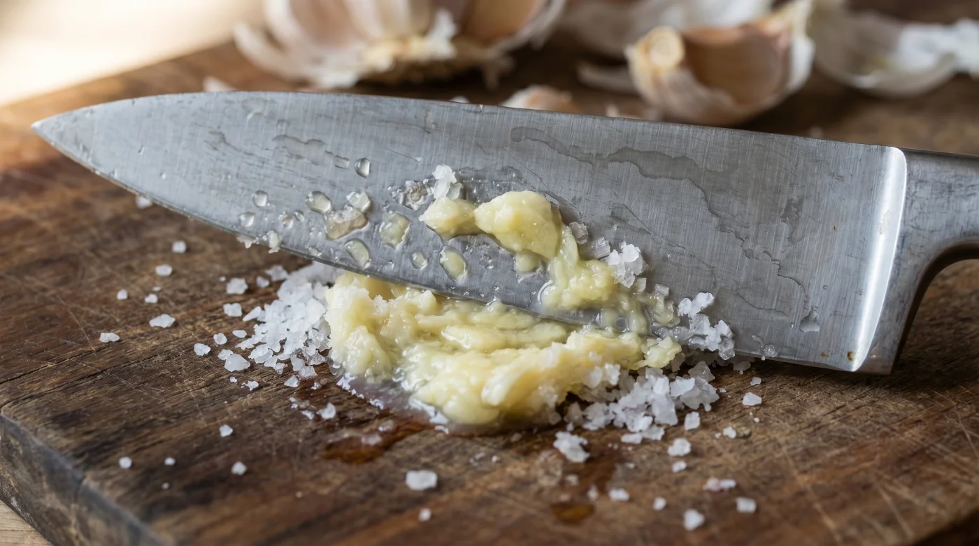 Det handlar om att förvandla en hård struktur till en silkeslen emulsion. När du låter några nypor strösalt möta vitlöken på skärbrädan händer något som känns mer som alkemi än traditionell matlagning. På mindre än en minut har du inte längre hackad lök – du har en gyllene, doftande kräm som smälter obemärkt in i vilken sås eller krämig gryta som helst, redo att lyfta smakerna inifrån och ut.
