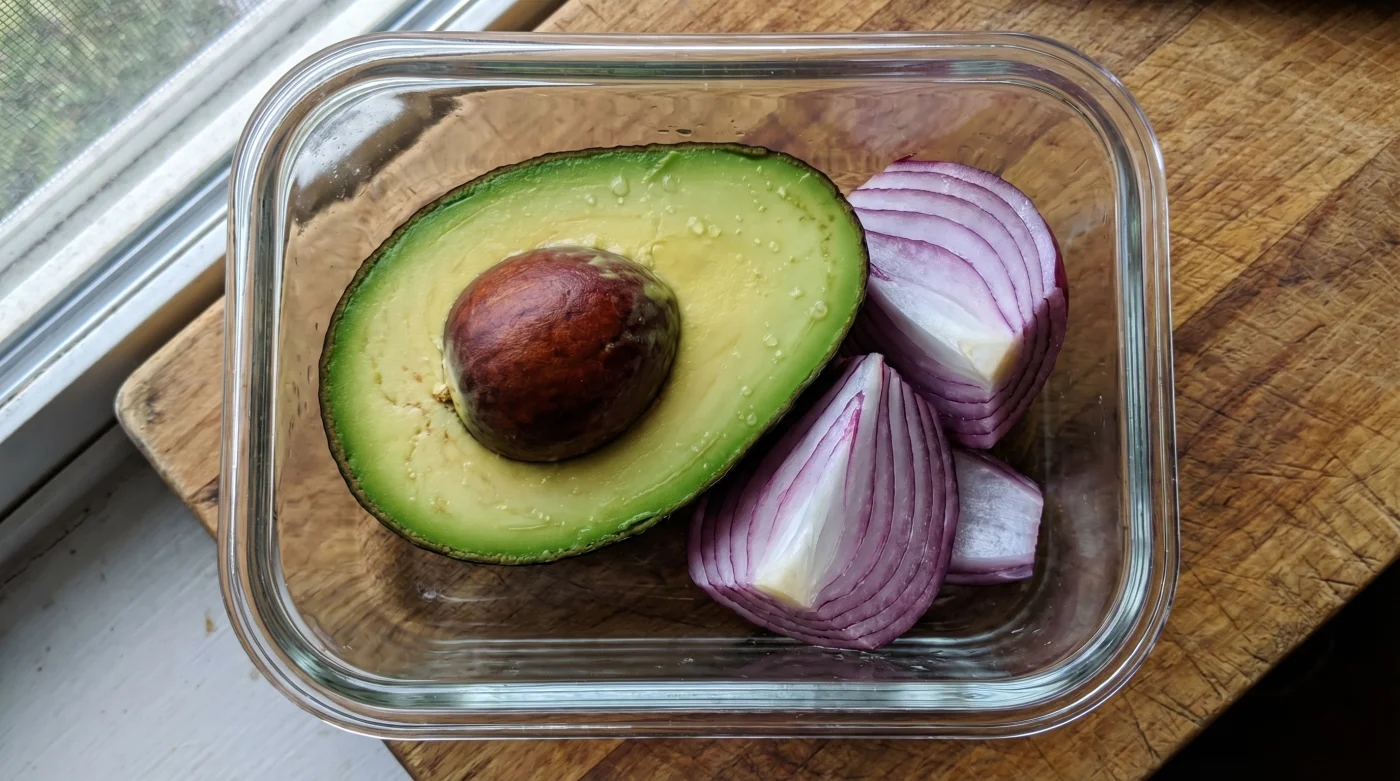 Här kliver löken in i bilden. Samma svavelföreningar som får dina ögon att tåras när du hackar en lök fungerar som en defensiv barriär. När du stänger in en bit lök tillsammans med avokadon i en lufttät burk, fylls utrymmet av dessa gaser. Det skapar en skyddande atmosfär som lägger sig över avokadon och pausar oxideringen helt.