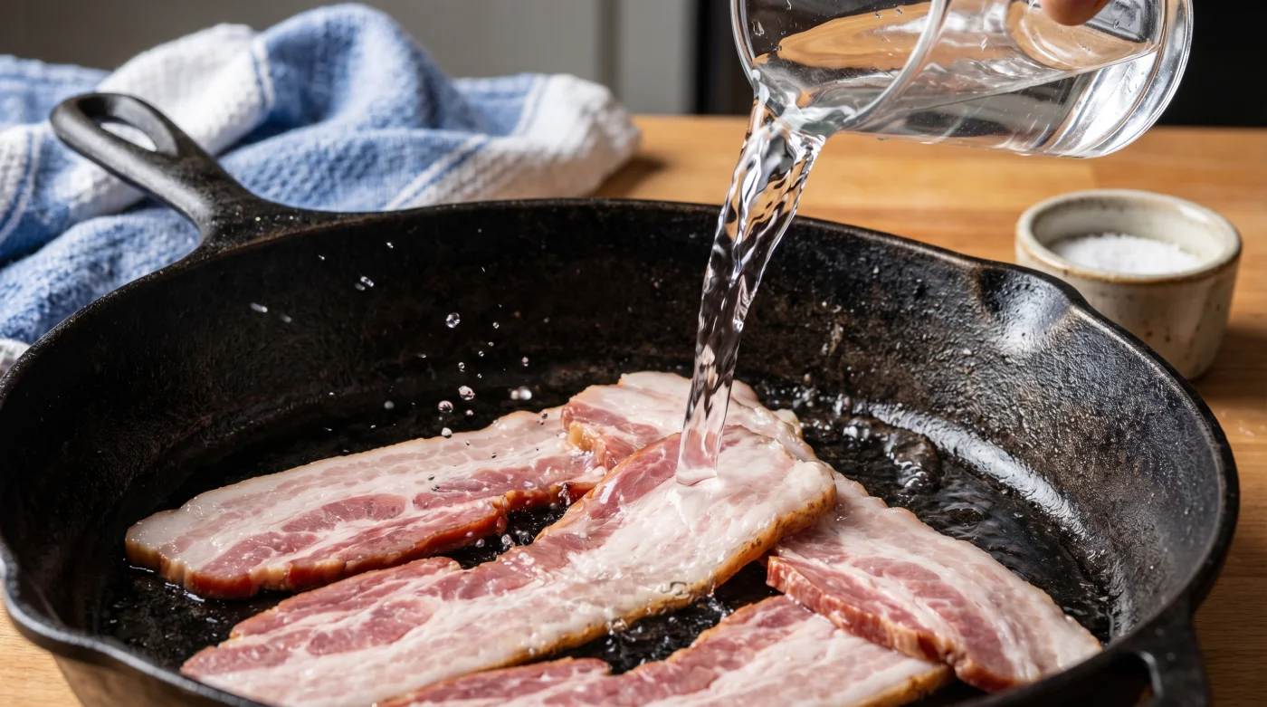 Att föreslå att du ska hälla kallt vatten över ditt frukostfläsk kan låta som rena vansinnet. Vi har alla fått lära oss sedan hemkunskapen att vatten och varm olja är en farlig kombination. Men hemligheten bakom detta lugn ligger i ordningsföljden och i kökskemins tysta logik. Genom att introducera en skvätt kallt vatten i en kall panna, direkt på det kalla köttet, skapar du en tillfällig, skyddande atmosfär.