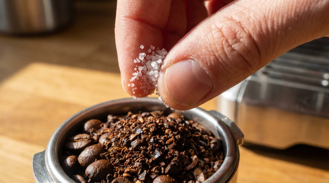 När du har doserat kaffet i filtret, tar du helt enkelt ett minimalt nyp salt direkt ur karet och släpper ovanpå bädden av kaffe. Detta räddar ofta äldre eller hårdare rostade bönor från att smaka bränt, och ger dig en mjukare start på dagen.