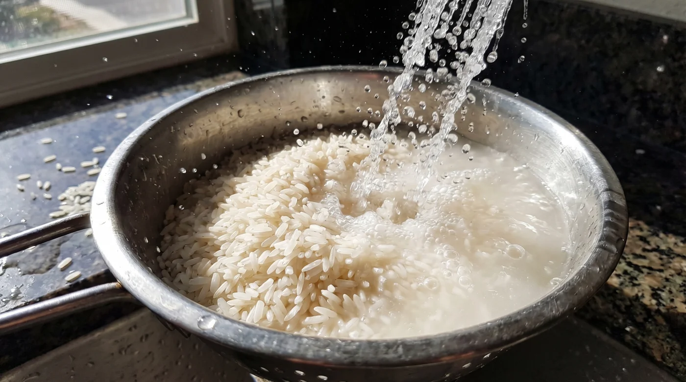Tänk dig riskornet som en liten tvättsvamp, rullad i ett fint damm. Detta damm är ytskiktets stärkelse, skapat av friktionen när hundratals riskorn har skavt mot varandra under resan från fältet till din lokala matbutik. Om du adderar kokande vatten direkt till denna pulvriga yta utan att skölja först, agerar stärkelsen precis som ett tapetklister. Den sväller omedelbart i hettan och låser fast kornen brutalt i varandra.
