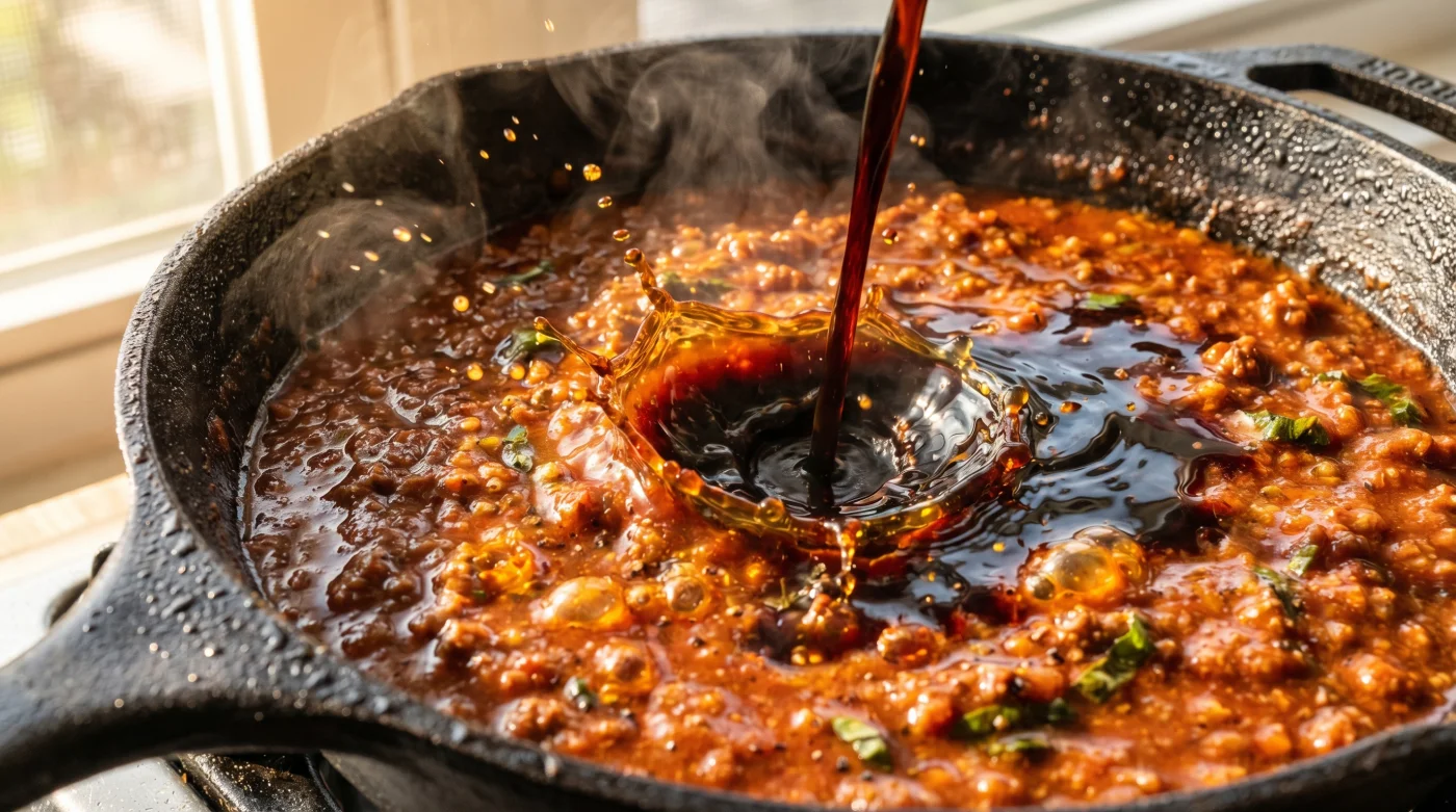 För dig som stirrar på klockan medan en hungrig familj väntar är metoden något annorlunda. Här är denna mörka vätska din främsta livräddare. När krossade tomater och färs kokar samman på spisen, tillsätt en rejäl skvätt. Den tar omedelbart bort råheten från de konserverade tomaterna och döljer effektivt att hela måltiden nyss blandades ihop under enorm tidspress.