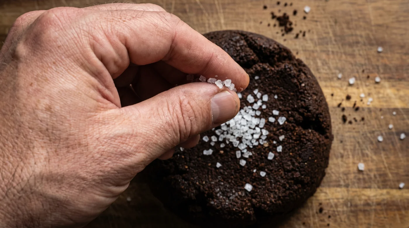 - Ta ett mycket litet nyp – vi talar om 10 till 15 korn – av ett fint bordssalt mellan din tumme och ditt pekfinger. Undvik stora flingsalt, då dessa löser sig ojämnt och kan ge oönskade lokala smaktoppar.