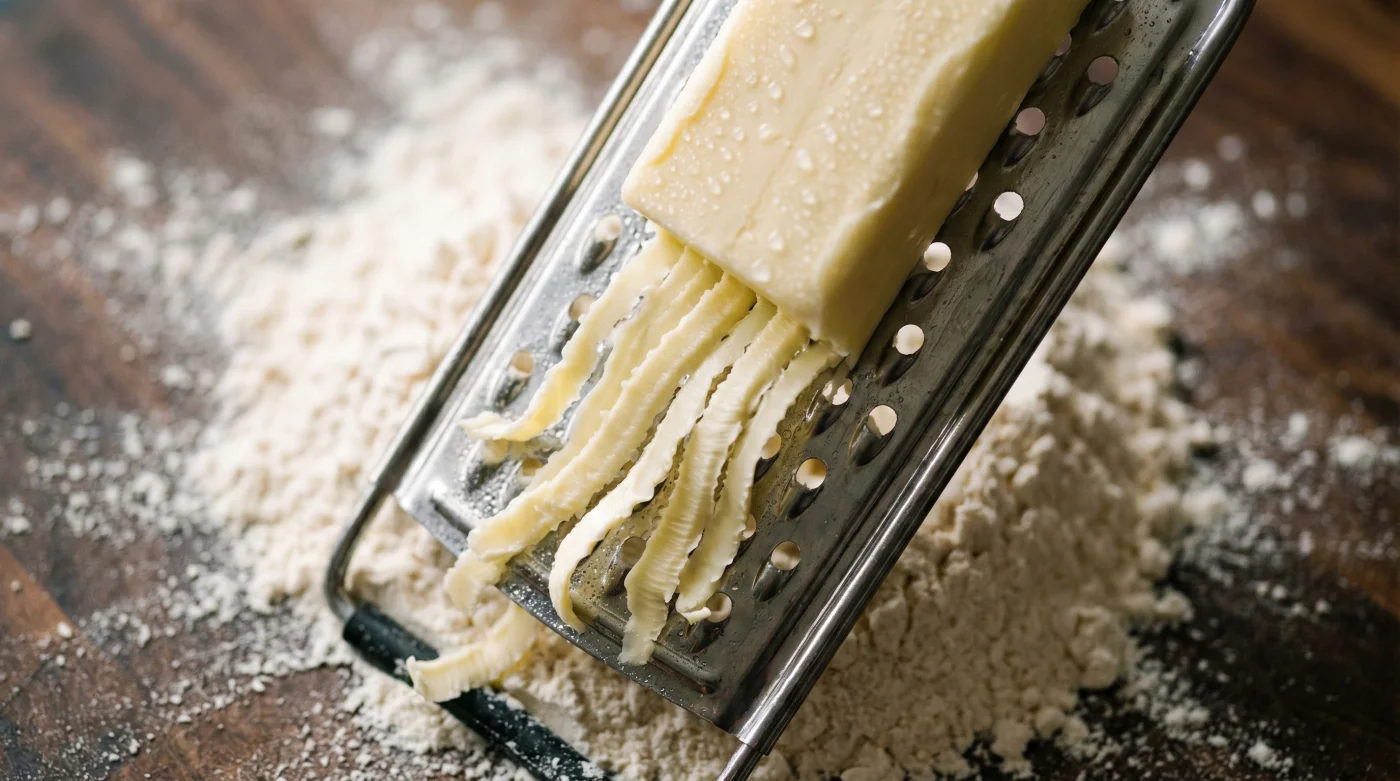 När du istället drar ett isande kallt, eller till och med fryst, smörpaket över den grova sidan av ett rivjärn skapar du tusentals distinkta fettflisor. Dessa små spån täcks genast av vetemjölet utan att krossas eller smälta. De lägger sig i degen som små vilande fickor av rent fett.