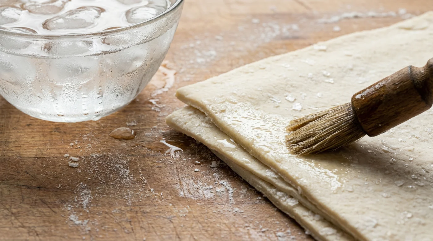 Här träder det kalla vattnet in som en oväntad lösning på ett frustrerande problem. Vatten skapar en våldsam och omedelbar ångchock när det plötsligt möter den brännheta luften i ugnen. Om du stryker iskallt vatten enbart längs degens råa snittytor, framkallar du en omedelbar explosion av instängd ånga inuti de papperstunna skikten. Isvattnet har ytterligare en fördel; det bromsar smörets smältning precis tillräckligt länge för att ångan ska hinna trycka upp lagren till sin fulla, dubbla höjd innan fettet hinner rinna ut.